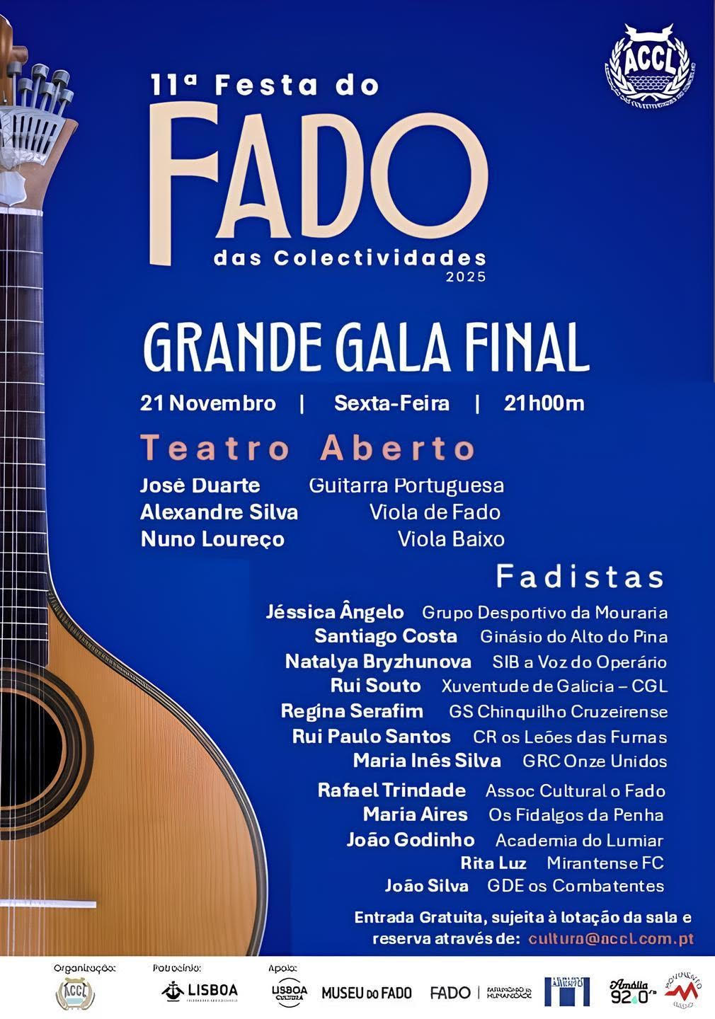 XI Festa do Fado das Colectividades 🎵🎤 É com grande satisfação que partilhamos que o nosso sócio e antigo dirigente associativo – João Silva, vai estar presente na final da Festa do Fado das Colectividades, uma iniciativa da ACCL – Associação das Colectividades do Concelho de Lisboa. 🎟️A entrada é livre mas sujeita a reserva de lugar. 21 de Novembro de 2025 21:00h Teatro Aberto João Silva ENTRADA LIVRE RESERVAS Contactos
