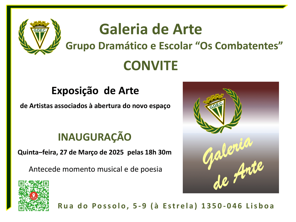Galeria de Arte n’Os Combatentes “Eu, tu, nós reciclamos.” Caros amigos e amantes da Arte, A Arte tem a capacidade de tocar as pessoas, podendo estimular reflexões e mudanças de comportamento. Num mundo cada vez mais preocupado com a sustentabilidade, a fusão entre Arte e a reciclagem será não apenas inovadora, mas essencial. Através da expressão artística, podemos transformar a percepção sobre o destino dos nossos resíduos e inspirar acções concretas em prol do meio ambiente de todos. Neste sentido, é com imenso prazer que convidamos a aderir a este projecto e juntos criarmos uma exposição de Arte, cujo tema será “EU, TU, NÓS RECICLAMOS”.Este evento especial tem como objectivo não apenas apresentar obras de artistas, mas também enaltecer a importância de promover a reciclagem nas nossas vidas e comunidades.Através de textos e obras expostas, esperamos inspirar os visitantes a reflectirem sobre como cada um de nós pode contribuir para um mundo mais sustentável. Detalhes da Exposição: Data: Quinta-feira, 25 de Setembro de 2025 Horário: 18:30 (antecede momento musical e declamação de textos e poemas) Os Combatentes – Rua do Possolo, Nº 5 – 9 (à Estrela), Lisboa O que Esperar da Exposição? Observar obras de artistas contemporâneos que apresentam suas interpretaçõesvisuais e ideológicas sobre a reciclagem. Ouvir declamação de poemas e textos alusivos ao tema reciclagem. Convívio com artistas que entendem o importante papel da Arte no alertar deconsciências para valorizarem a reciclagem. Elaboração de frases onde todos podem expressar suas visões sobre o acto de reciclar. Juntem-se a nós nesta jornada artística em direcção a um mundo mais sustentável. A sua presença será um apoio à Arte, mas também um testemunho do seu compromisso com a RECICLAGEM. Divulgue esta iniciativa junto de quem possa ter interesse.Esperamos a sua adesão e presença! Qualquer questão que surja, entre em contacto através do nosso e-mail: galeria@gdecombatentes.pt ou geral@gdecombatentes.pt